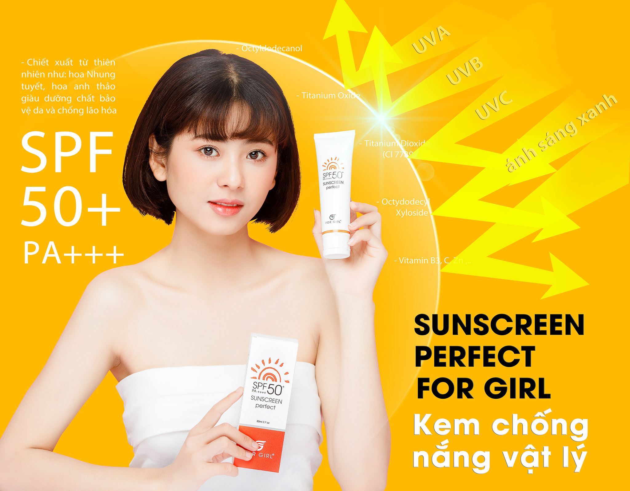 - Kem chống nắng vật lý SUNSCREEN PERFECT FOR GIRL chính là “chìa khóa” giúp bạn đánh tan các nỗi lo về làn da đen sạm mà nắng mang đến,bảo vệ và gìn giữ làn da bạn trước tác nhân gây hại của ánh nắng một cách tối ưu và hiệu quả nhất.