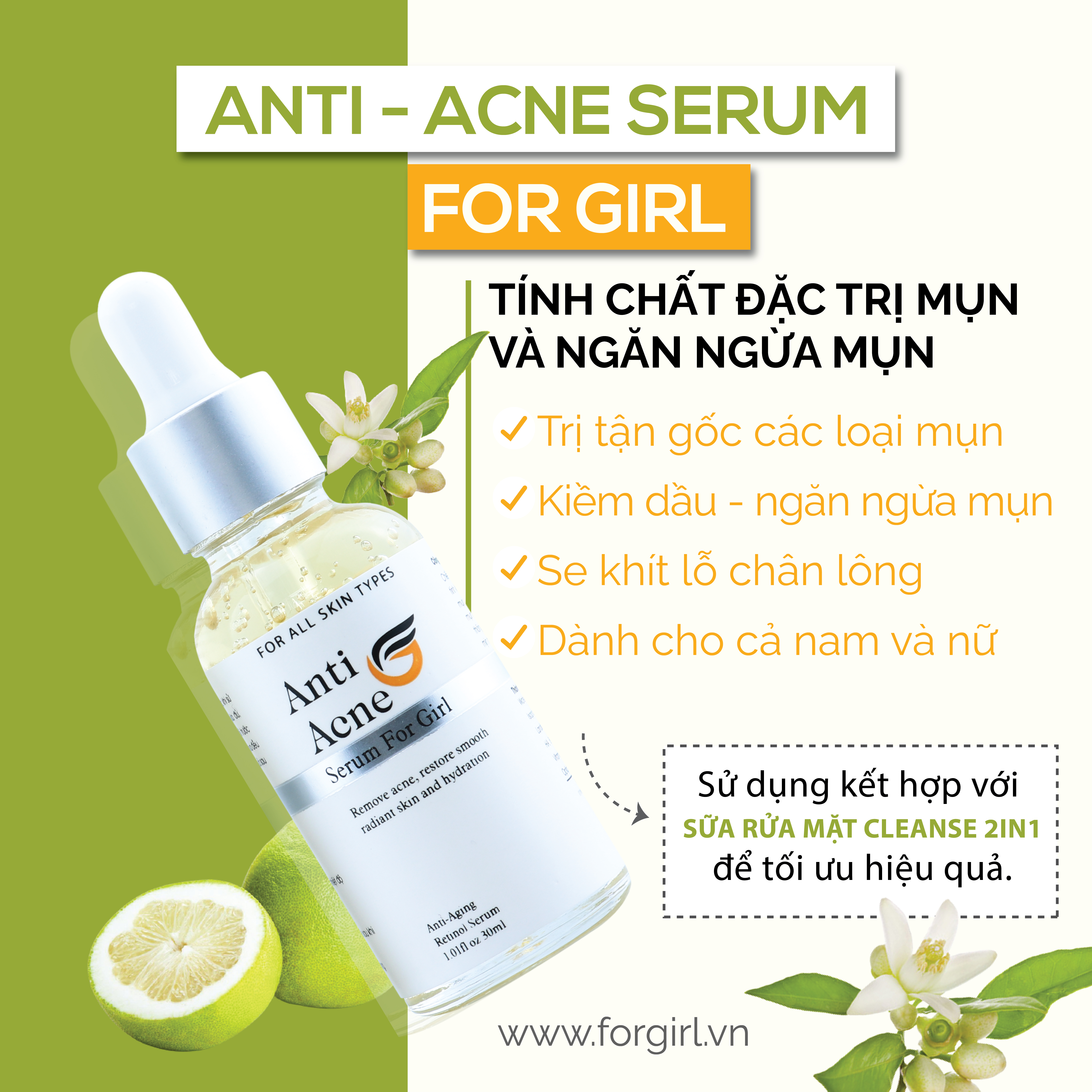 Serum đặc trị mụn Anti Acne For Girl là giải pháp trị mụn tận gốc có thể dùng cho cả nam và nữ. Sản phẩm được các bác sĩ da liễu khuyến cáo sử dụng, rất thích hợp với những người mới bị mụn và bị mụn lâu năm.